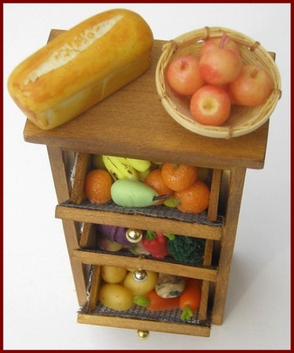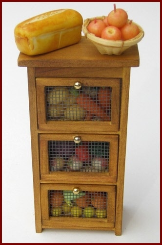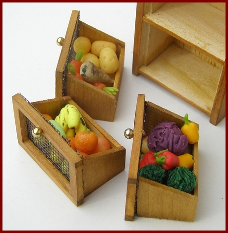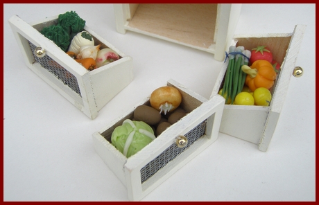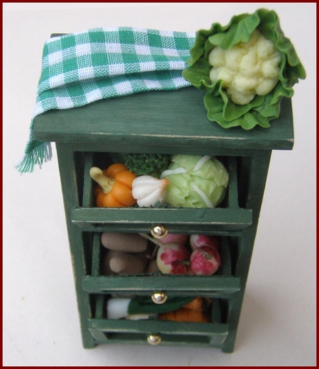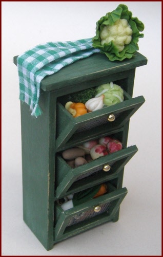 Vegetable storage safe in shabby green finish, with three tilting bins. Each bin is filled with a variety of vegetables. The bins can be removed, but all of the vegetables are glued in place in the bin.